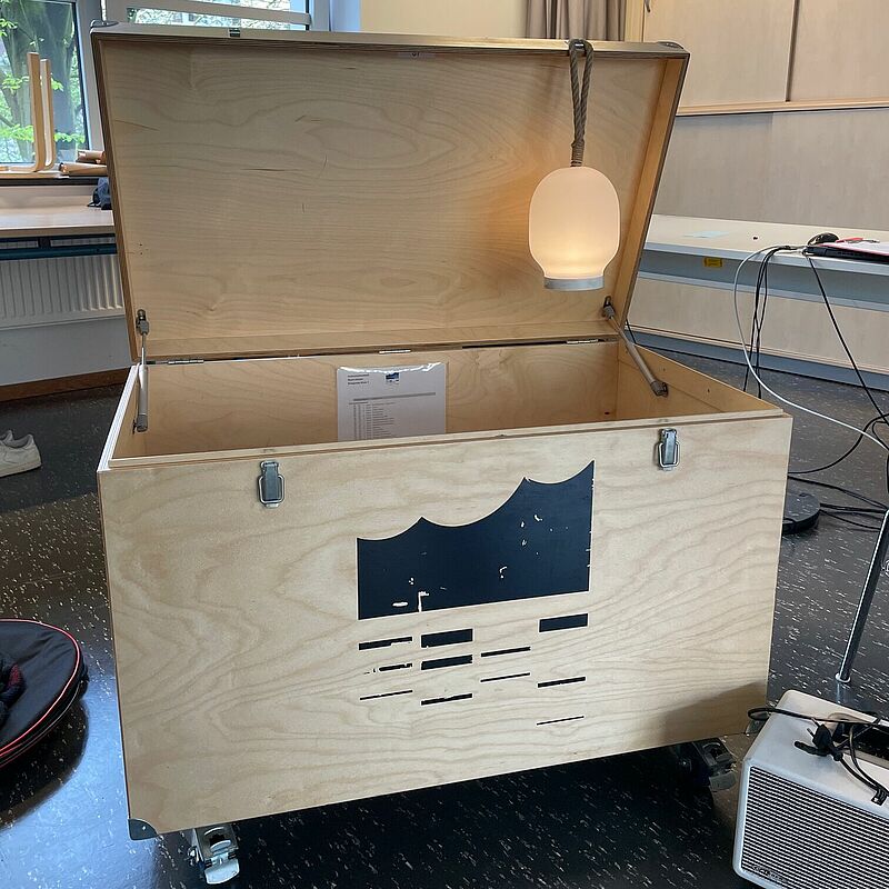 Sara und Martin vom Education-Team haben eine "Klingende Kiste" mitgebracht und den Klassen E2-23-8-4 und E-24-2-1 das Projekt erläutert und praktisch erproben lassen.